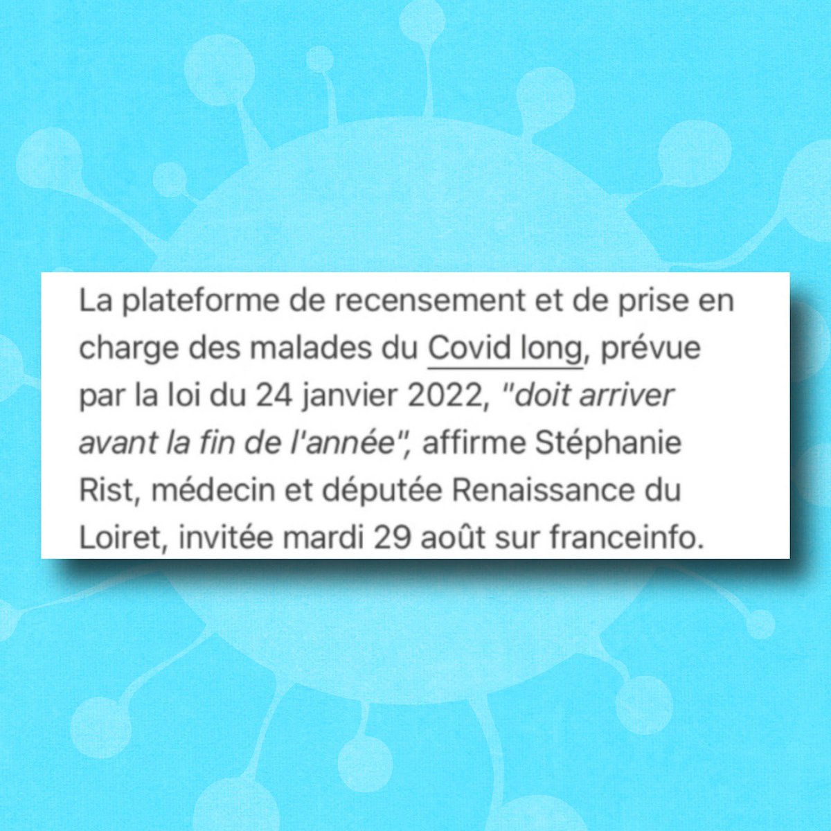 🗣️La députée @stephanie_rist aurait annoncé à @franceinfo le 29 août que "La plateforme de recensement et de prise en charge des malades du #Covidlong, prévue par la loi du 24 janvier 2022, doit arriver avant la fin de l'année"