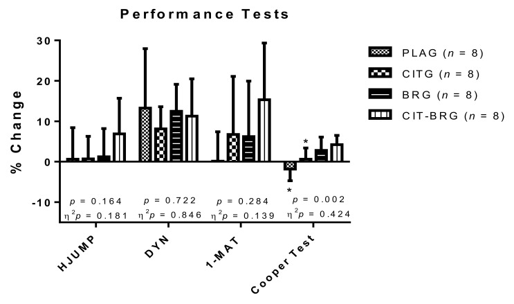 5. In the first one performance outcomes were studied after a chronic (9 weeks) of combined supplementation (citrulline + nitrates) in comparison with a placebo, a nitrate and citrulline supplementation groups.