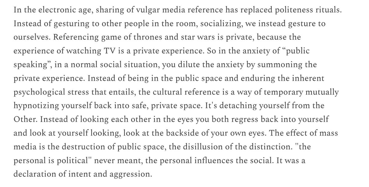 @robertlasagna1 Somebody who makes a movie reference in conversation, or dresses up in some outfit they found on Reddit for a concert, is trying to escape the social tension of being in a public setting by alluding to something they discovered in a private setting.