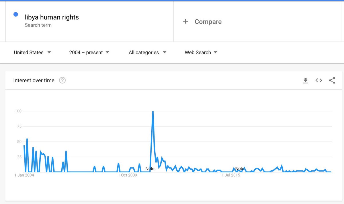 Interest & use of the phrase "Libya human rights" peaked in March 2011, just hours before the US led a massive intervention in the country, overthrowing President Gaddafi, and turning North Africa's most prosperous country into a failed state, replete with open-air slave markets.
