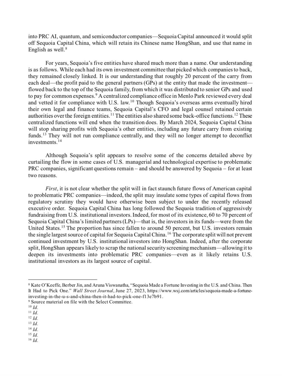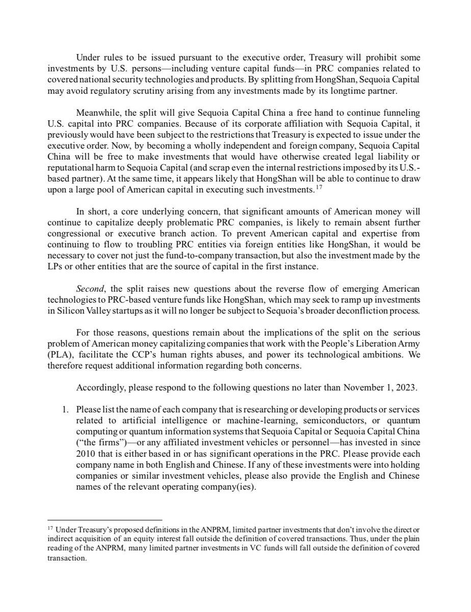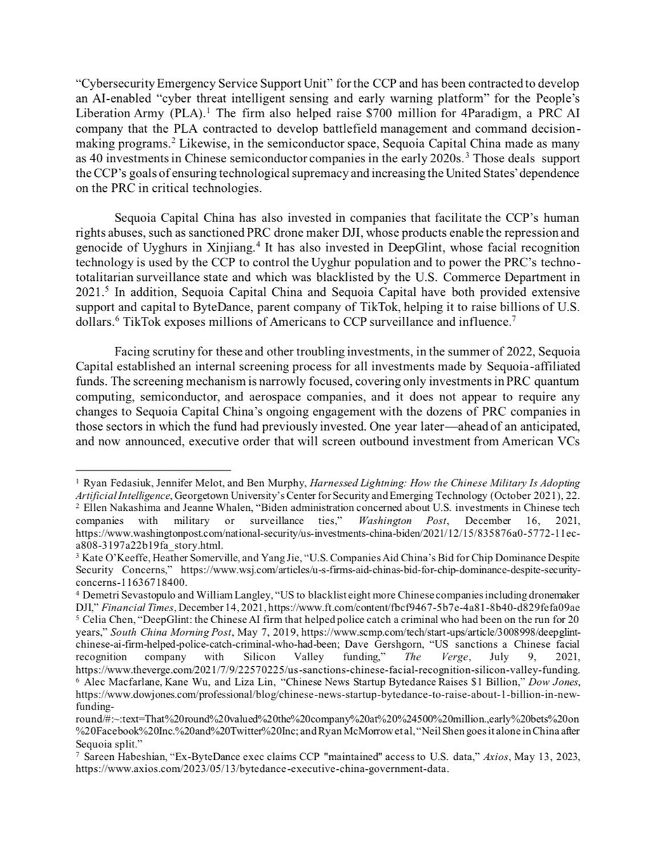 “[S]plitting off its China business … is a step in the right direction. However… Sequoia Capital China’s significant U.S. dollar investments in PRC entities have included certain investments that contributed to the CCP's human rights abuses, the PRC's military modernization, and its overall efforts to undermine U.S. technological leadership.”