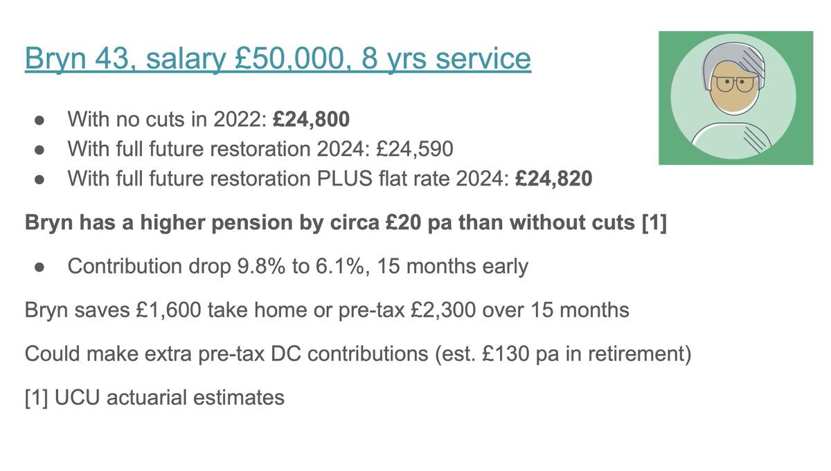 He too comes out slightly better off thanks to UCU than if the 2022 cuts and our compensation for them had never happened. But again Bryn benefits from potentially 15 months of contributions at 6.1% instead of 9.8%.