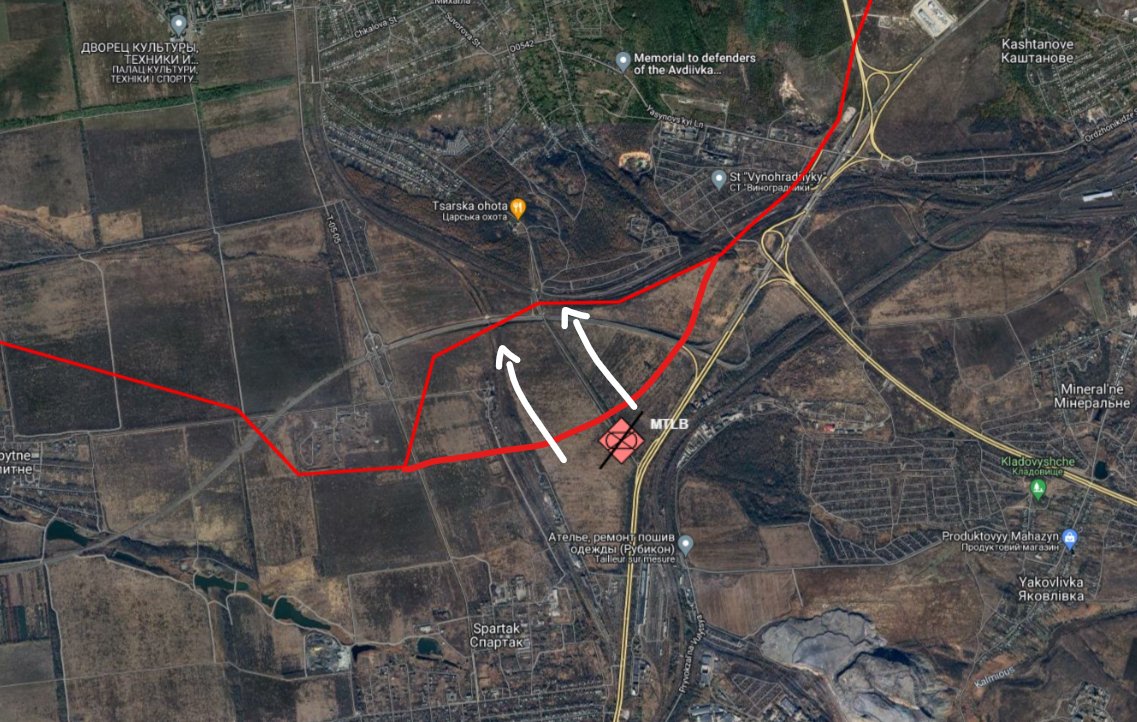 Au Sud d'Avdiivka, on ne compte qu'un seul MTLB, j'ai quand même partagé la zone parce qu'elle montre la seule avancée Russe depuis le début de l'offensive dans cette zone ultra fortifiée).