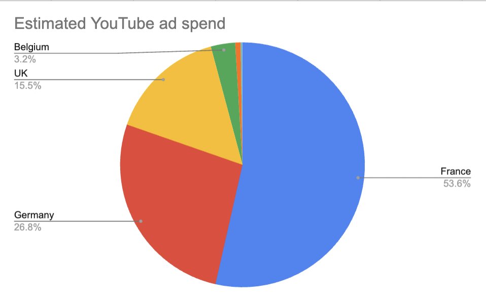 Semrush is an analytics platform that estimates what accounts have spent on ad campaigns. Together with Google’s ad transparency center, we can see they've heavily targeted France, Germany and the UK, then some others, with 88 ads Oct 7-19. 2/