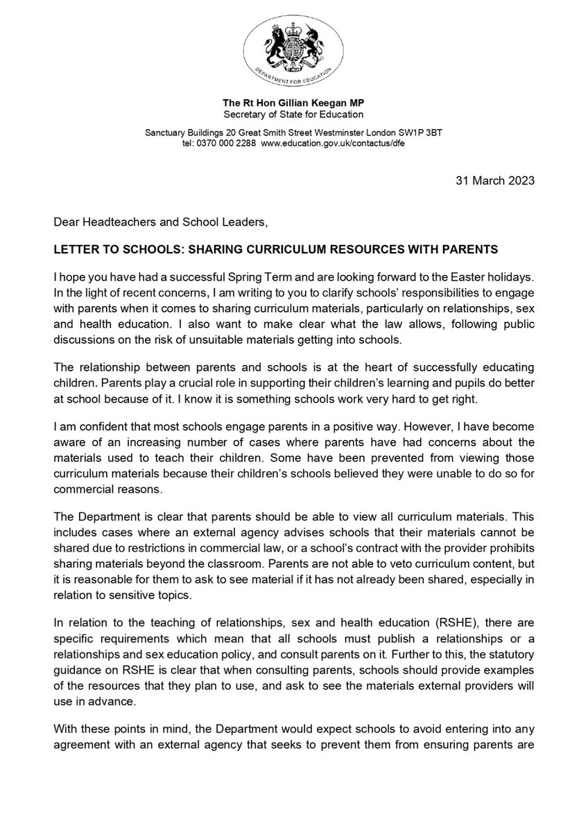 The Education Secretary has written to schools about sex ed, telling them they shouldn't be using resources with copyright/commercial reasons preventing said resources from being shared outside school premises - something that can be quite common with external agencies /1