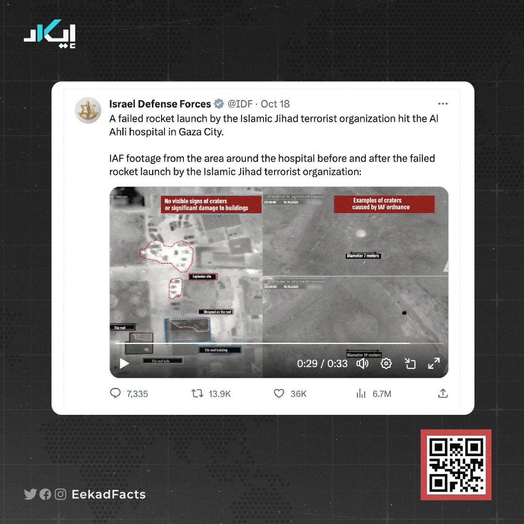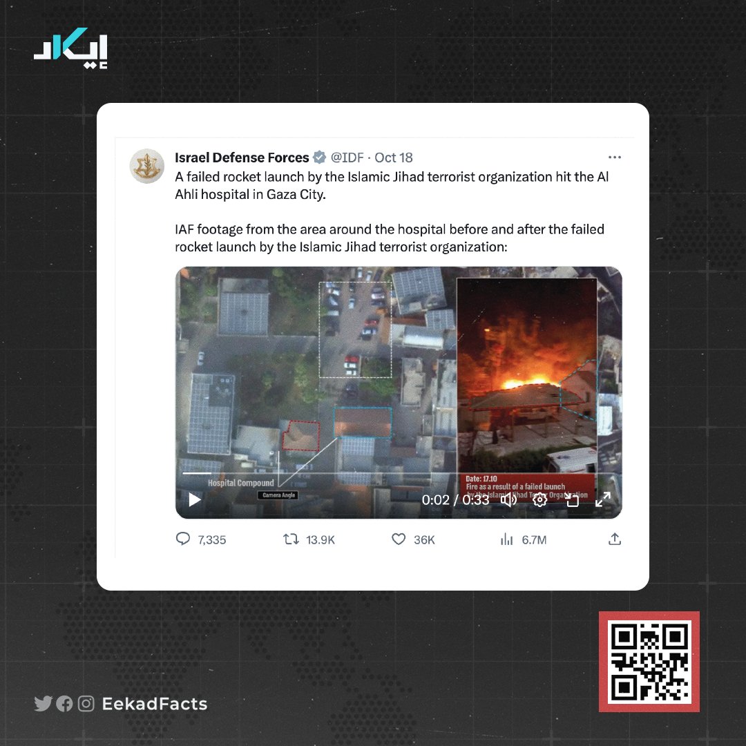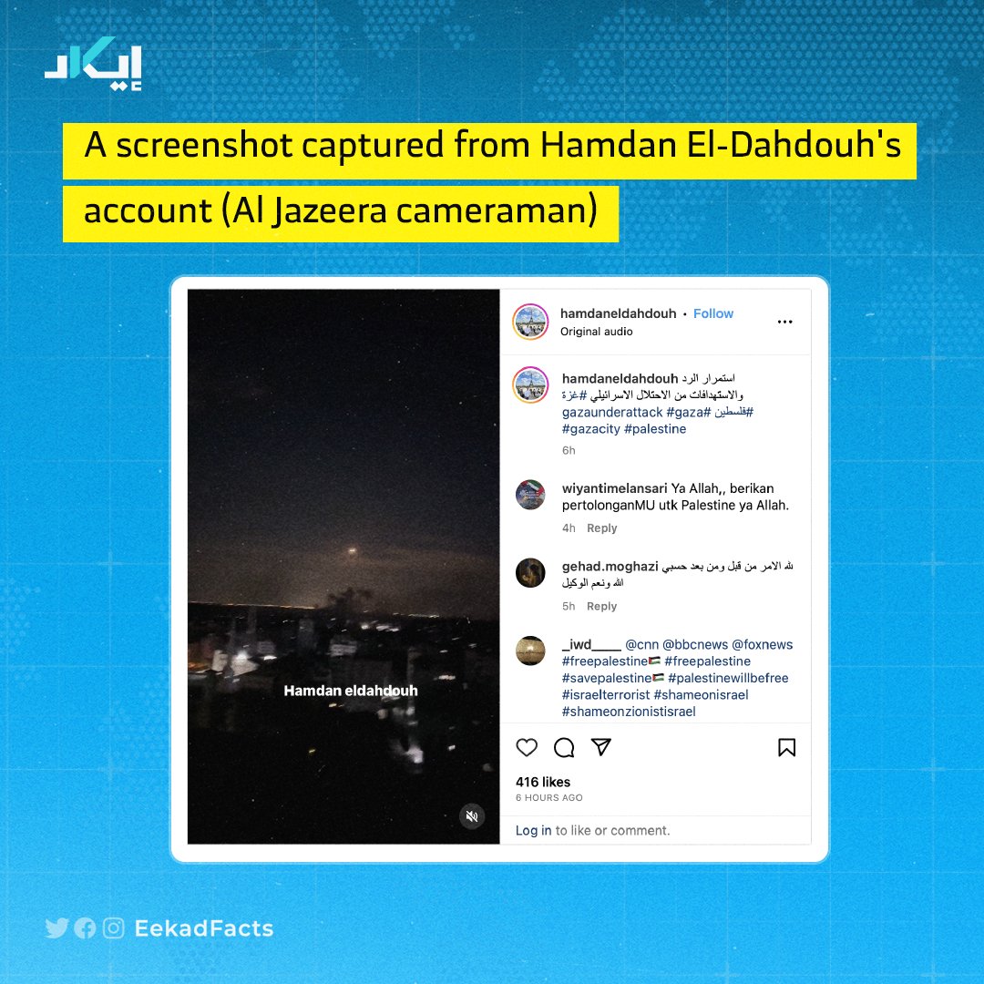 🔻Eekad’s team collected and analyzed all available videos capturing the hospital attack. The initial lead came from a clip posted on Instagram by Al Jazeera cameraman Hamdan El-Dahdouh, which coincided with the live explosion broadcasted by Al Jazeera at 18:59 on Tuesday.