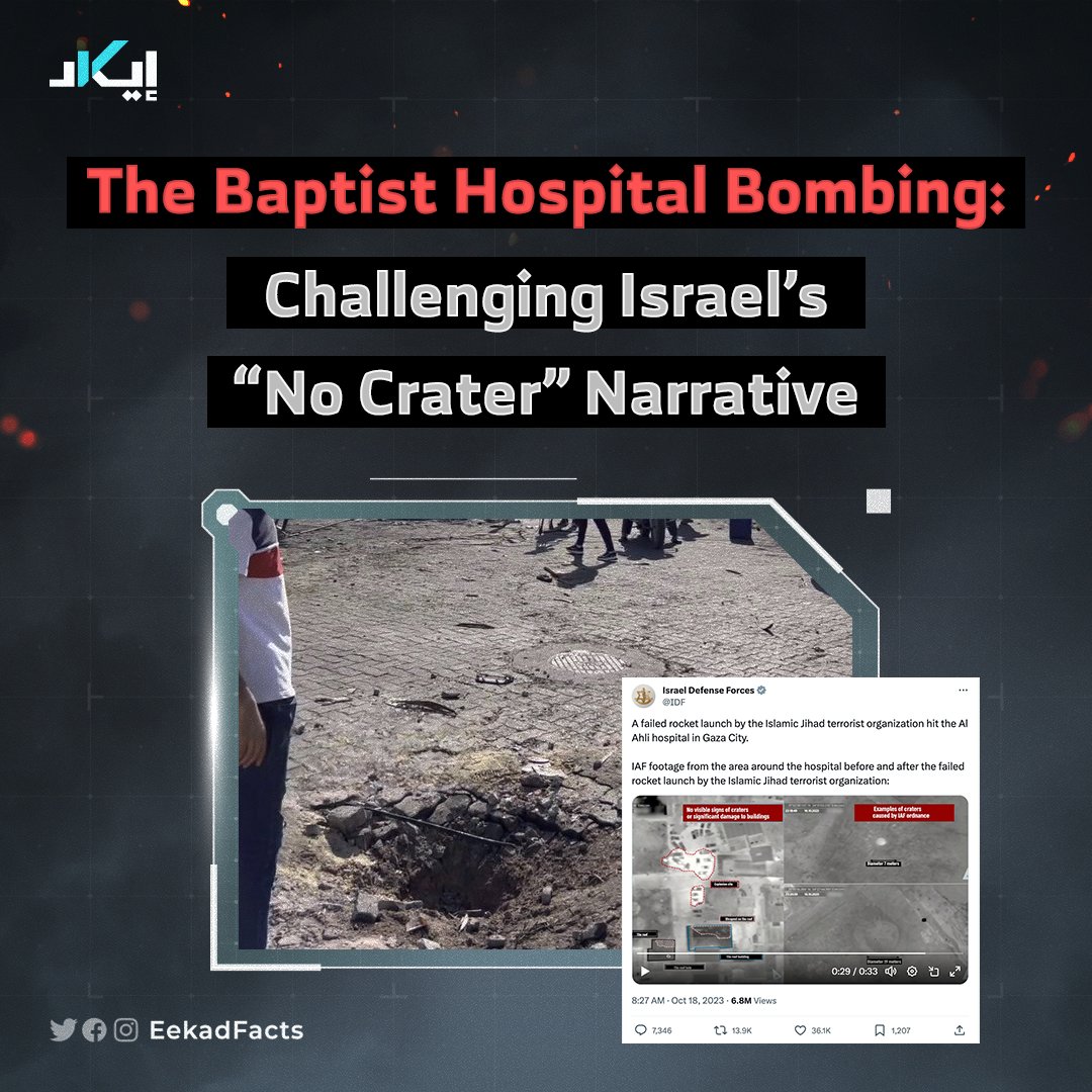 🔻بعد انتشار صور لساحة مستشفى الأهلي المعمداني عقب استهدافها، بدأت حسابات إسرائيل تُنكر مسؤوليتها، متعللة بعدم وجود حفرة عميقة مكان الانفجار، واعتمدت على فرضية استحالة سقوط قذيفة تدميرية قادرة على قتل 500 شخص وجرح المئات دون ترك حفرة كبيرة في أراضيه: