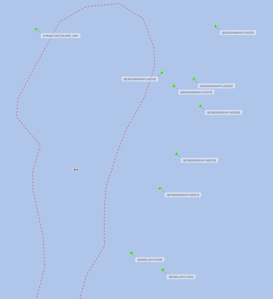 3/Three hours ago, 2 #China Coast Guard ships also suddenly appeared on AIS, visibly joining the flotilla. How long they’ve been there is unknown, but now they want to be seen.