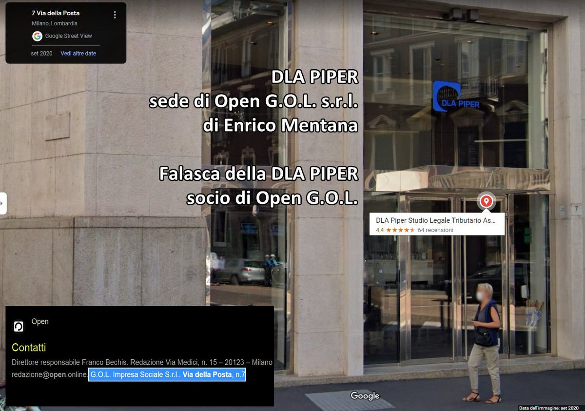 1. Open ha sede legale presso DLA Piper, che l'ha fatta nascere. Falasca di DLA Piper è socio di Mentana in Open.