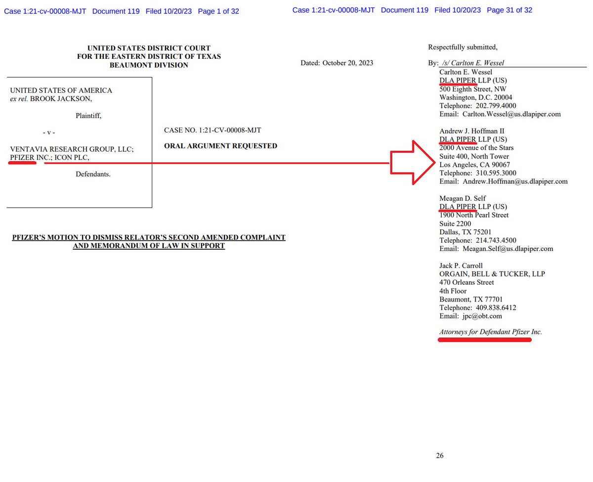 DLA Piper è lo studio legale che difende Pfizer nella causa per frode nello studio clinico, intentata da Brook Jackson, responsabile del trial di Pfizer.