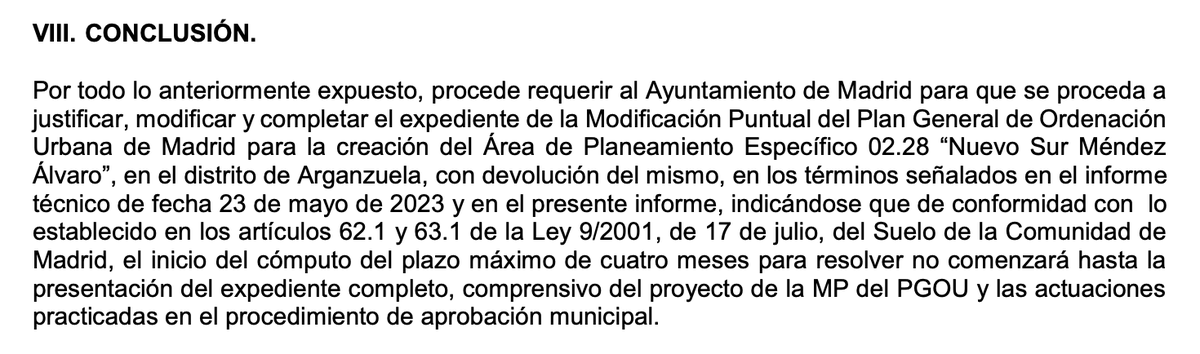 Pues resulta que, tras esa aprobación del Ayuntamiento de Madrid en febrero de 2023, se le mandó a la Dirección General de Urbanismo de la Comunidad de Madrid... y va y responde que no. Que esto es un poco chapuza. Que hágalo bien, y que nos lo envíe de nuevo si eso.