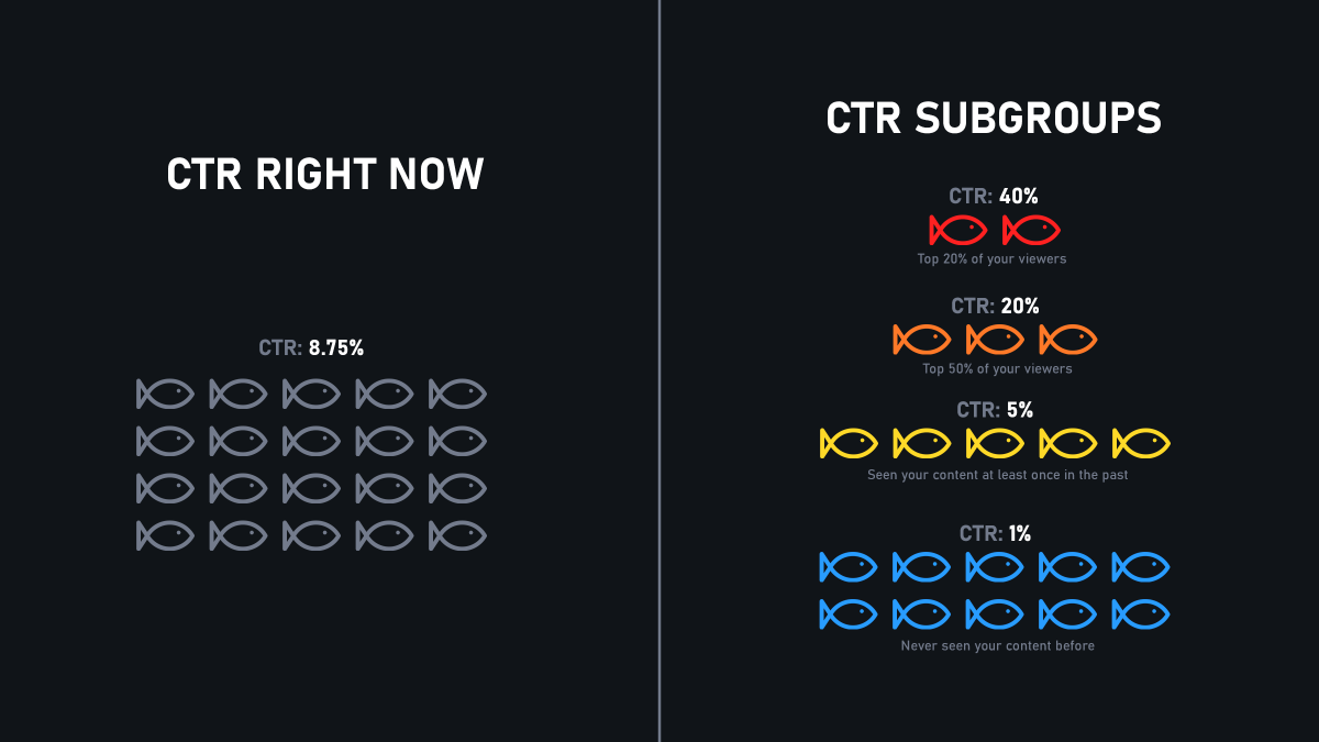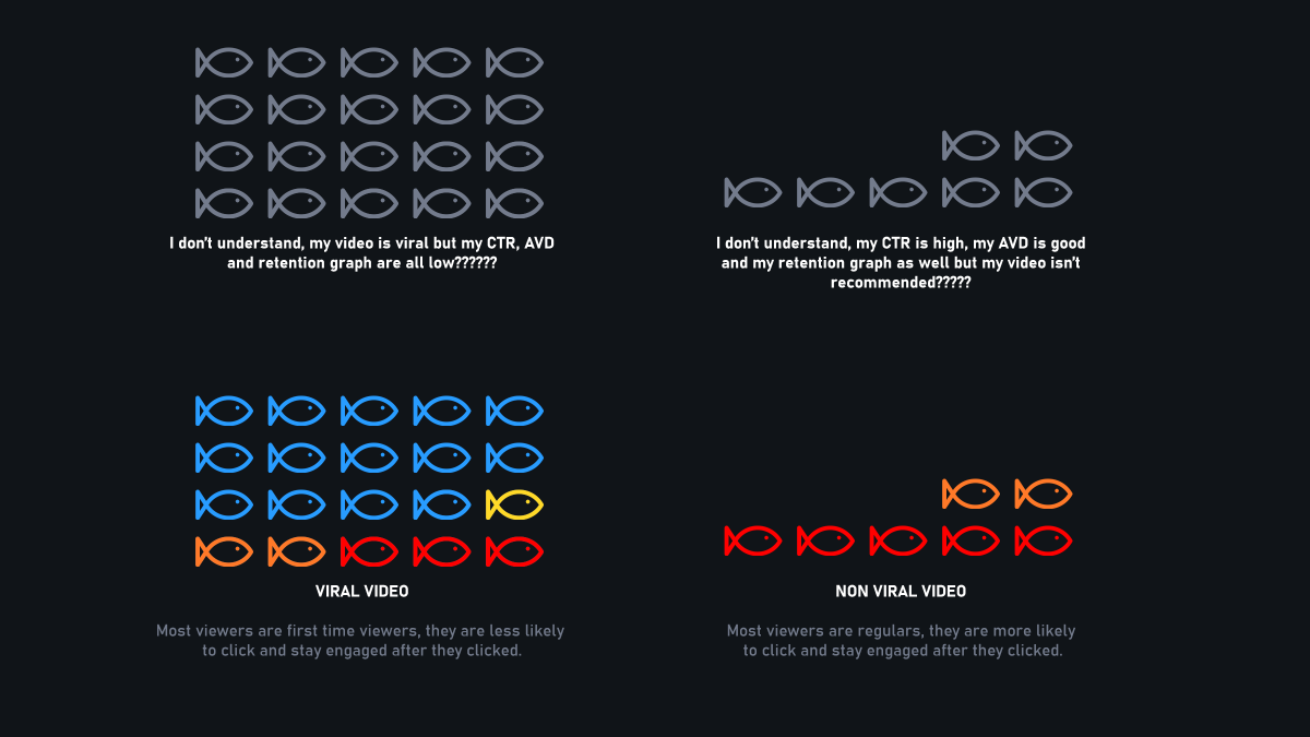 That's why when a video goes viral, CTR drops because the number of blue viewers (cold) increases drastically compared to red viewers.