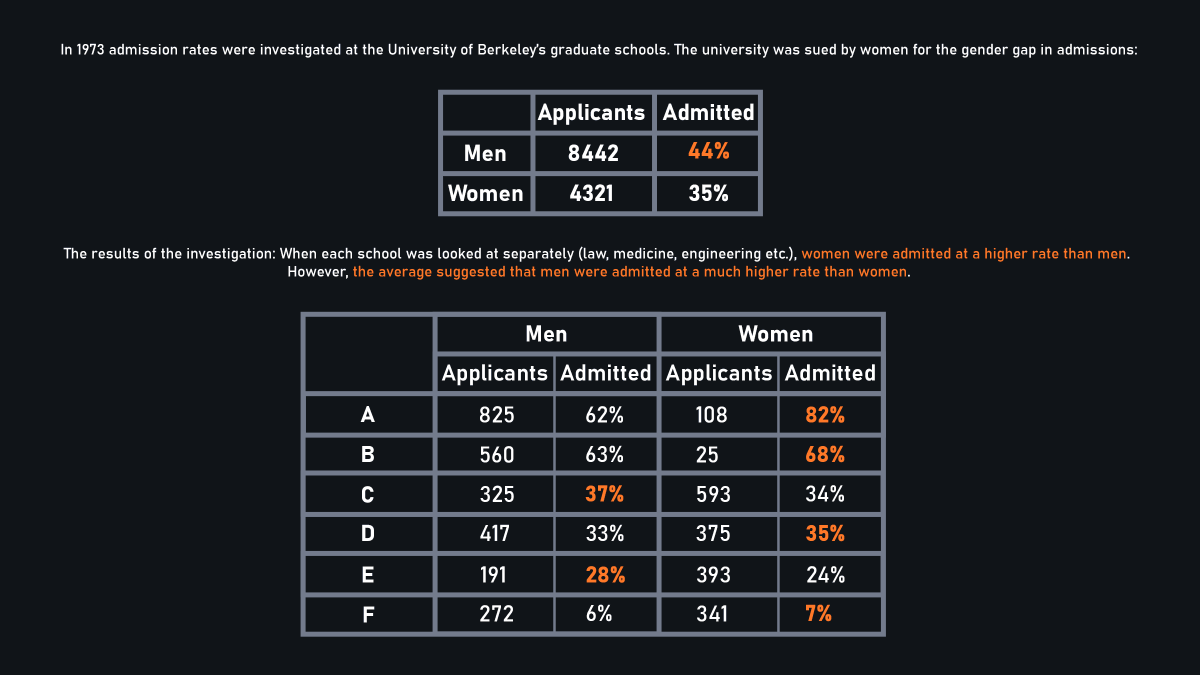 When analyzing groups separately, data shows one trend, but when combined, an opposite trend emerges due to the groups' composition.