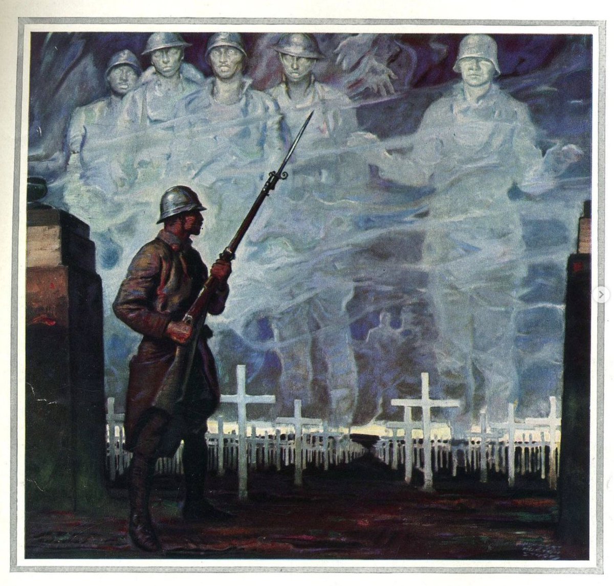 'Who goes there?' — American anti-war illustration (1938) showing a sentry haunted by the ghosts of soldiers from the First World War. Artist: Herbert Morton Stoops.