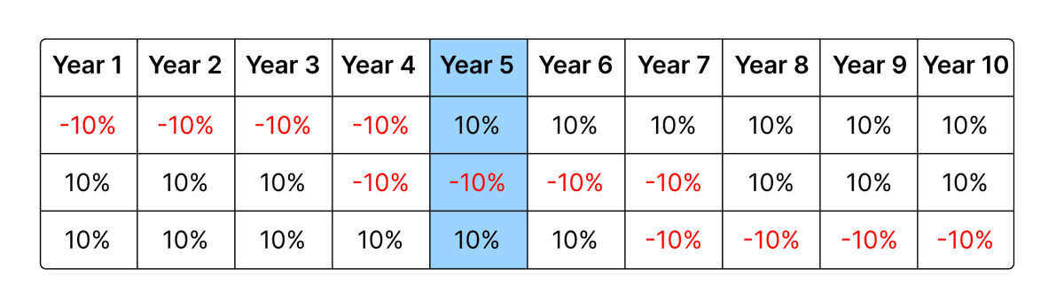 3/10 - For simplicity, assume the market return, ‘on average’ over ten years is positive. Each year either generates a +10% or -10% return. Assume that on any 10-year rolling basis, there are only 4 -ve years. The sequence in which these -ve returns can occur is random.
