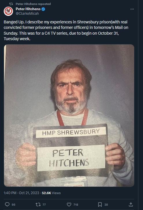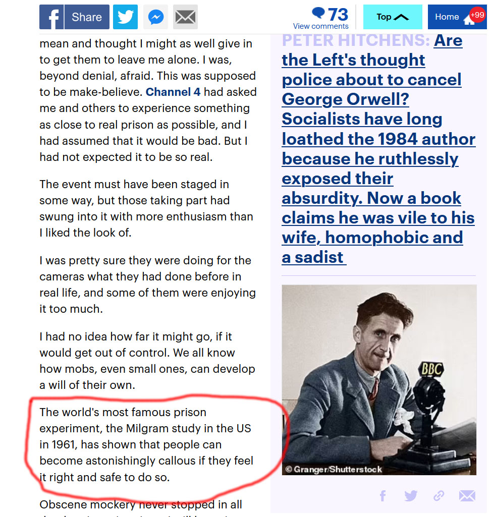 In this article for the Mail, about a so-called prison experiment on Ch4, Hitchens refers to the "The world's most famous prison experiment, the Milgram study in the US in 1961". No the Milgram experiment was not about prison.