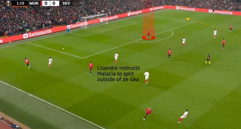 Wan-Bissaka, the player closest to the centre back position, sprints to split either side of de Gea.
