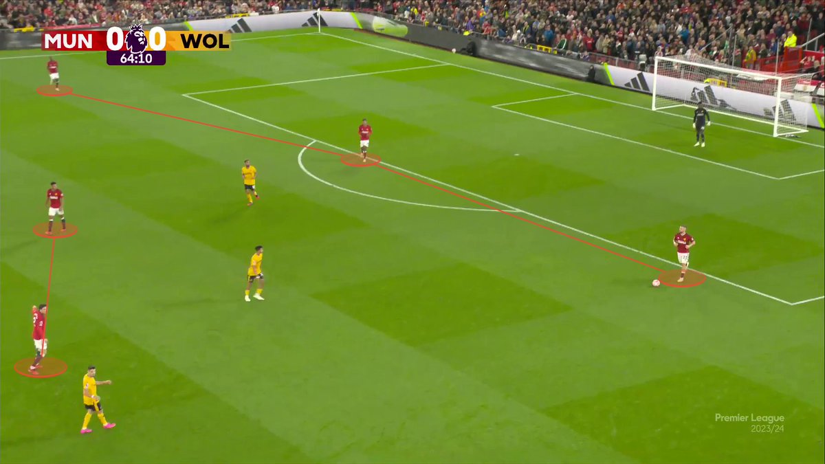 To start the season against Wolves, United built play in the same fashion as last season with Martinez inverted from centre back and Shaw splitting to one side of Onana.