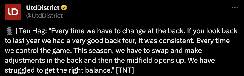 It's also key to note that United have been killed with injuries this season, and it led ten Hag to mention the difference between this & last season.
