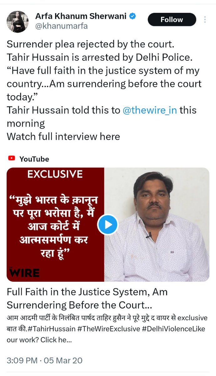 When Tahir husain was on run after killing IB officer Ankit, She met him secretly n took his interview