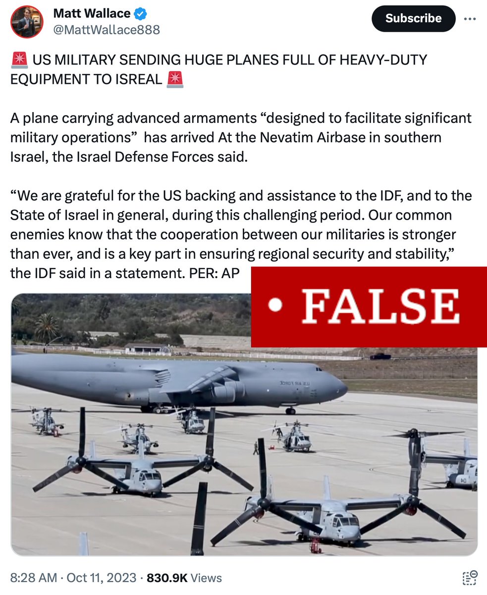 This video, viewed 1.4 million times, falsely claims to show thousands of US marines landing in Israel tonight to join the war against Hamas.