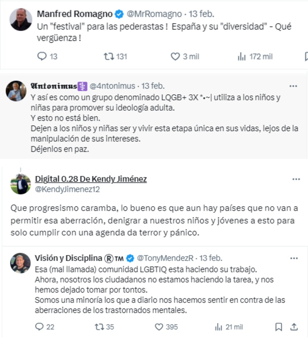 2) Tras esto empezaron a salir los comentarios que repetían esta narrativa, uniendo el desfile a la izquierda, con ataques al "progresismo", "diversidad" y especialmente a las personas LGTBI+, intentando incidir en la narrativa ultra que une pedofilia y homosexualidad.