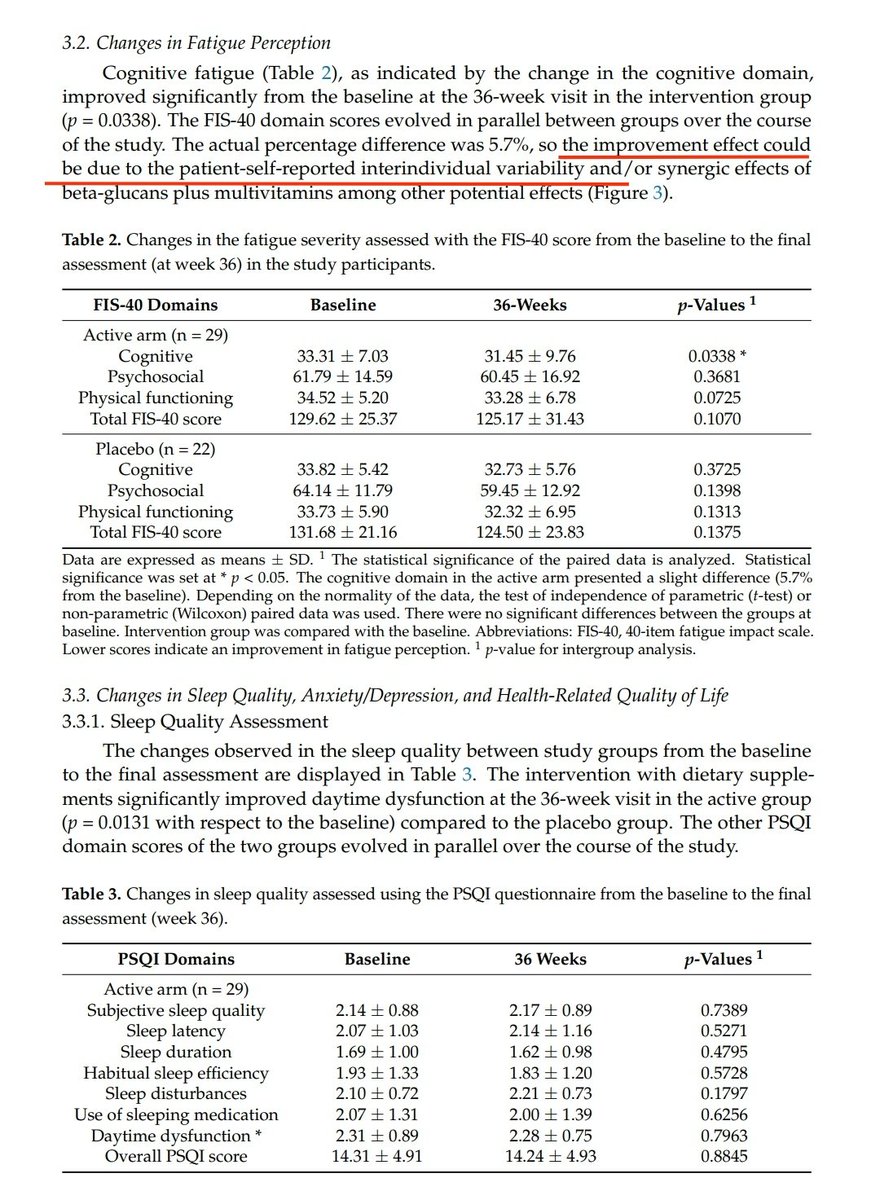 Respecto a la fatiga, solo la percepción de la fatiga cognitiva mejoró significativamente y aun así los autores reconocen que esta mejoría puede deberse a la variabilidad interindividual.10/