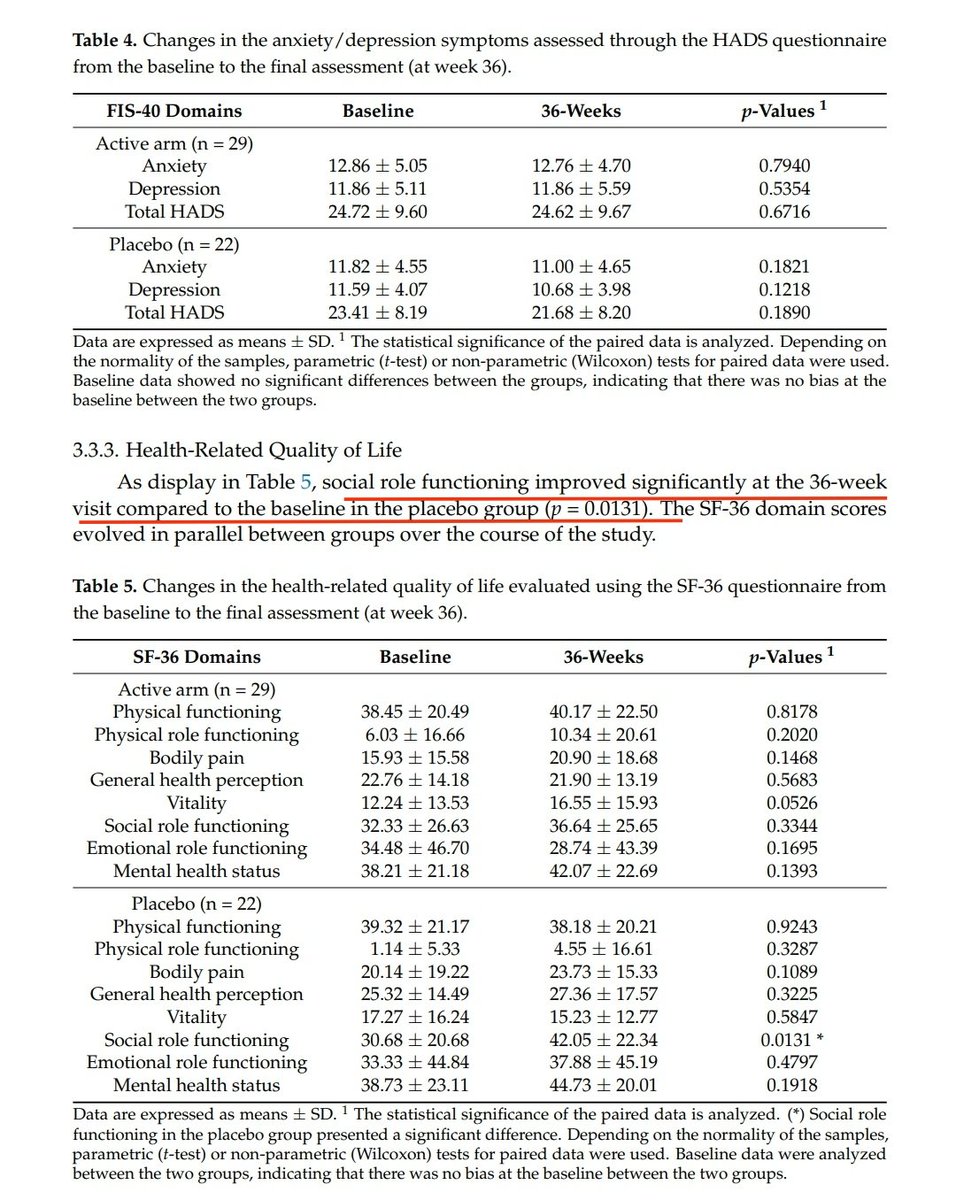 Del resto de objetivos secundarios (sueño, depresión y ansiedad y calidad de vida) solo un valor resultó en mejoría estadistícamente significativa, pero en el grupo placebo!