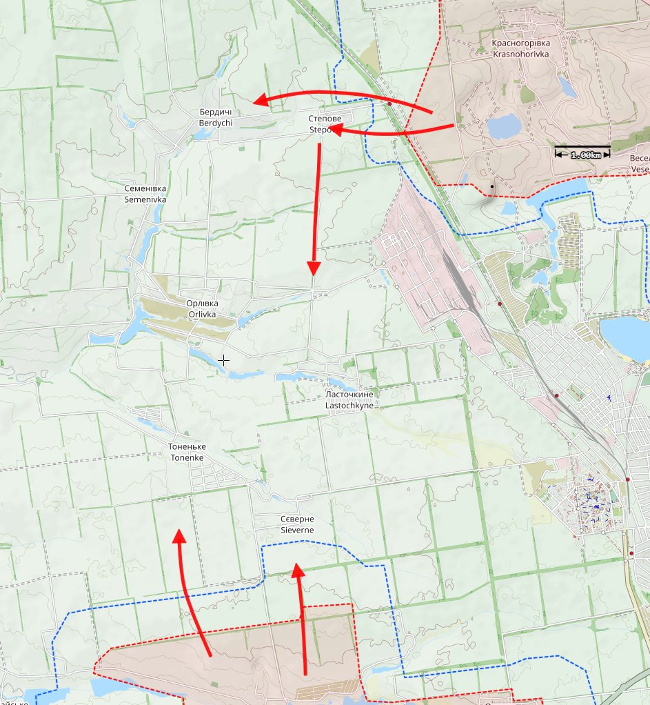 The Russian attacks on the flanks of the city are aimed at the edges of this bowl. If Russia manages to gain a hold on Stepne and Berdychi on the northern- and Severne on the southern flank, would mean that Russia can easily observe much of that lowland.