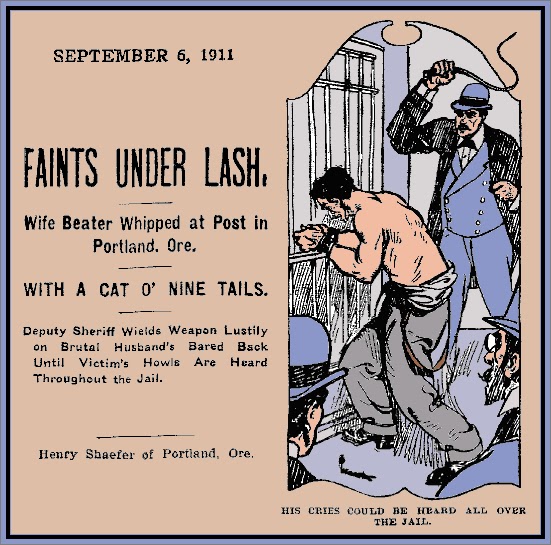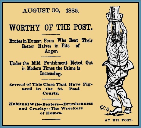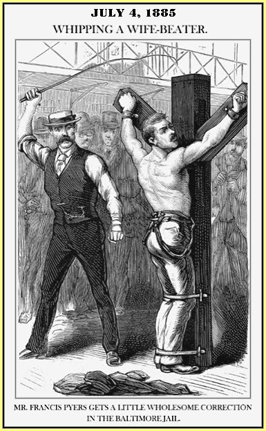 En esta otra imagen de periódico del 30 de agosto de 1885 vemos cómo se expone que los castigos con azotes en los que el reo es atado a un poste y allí azotado son aplicados a varios tipos de delincuentes, entre ellos los "wife-beaters" o golpeadores de esposas.