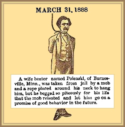 Este recorte de periódico, de marzo de 1888, muestra a un maltratador que estuvo a punto de ser asesinado por un mafioso dentro de una prisión en Minnesota mediante ahorcamiento, pero que prometió comportarse mejor en el futuro y se le dejó vivir por ello.