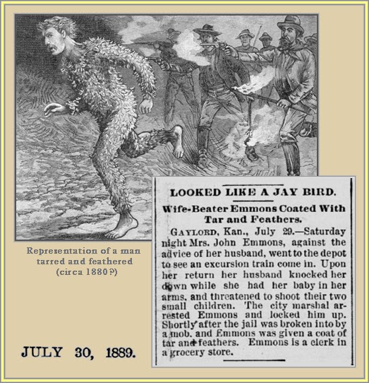 Este otro recorte de periódico, de julio de 1889, se nos muestra a un maltratador siendo cubierto de alquitrán y plumas en una prisión, condenado por agredir a su esposa mientras llevaba a su bebé en brazos y amenazando con disparar a sus hijos pequeños.