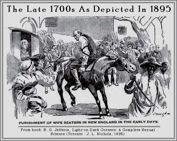 Aquí un libro de 1895, donde se muestran castigos a maltratadores llevados a cabo en Nueva Inglaterra en el siglo XVIII. En la ilustración vemos al maltratador siendo atado por varias cuerdas de las que tiran varias personas distintas en direcciones diferentes.