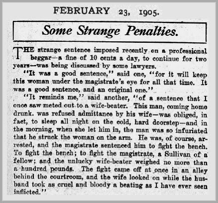 Este recorte de un artículo de un periódico de Minneapolis publicado en febrero de 1905 muestra un caso de un maltratador que fue arrestado tras ser enviado a dormir a la intemperie por su propia víctima, y condenado a enfrentarse a un hombre mucho más robusto y fuerte que él.
