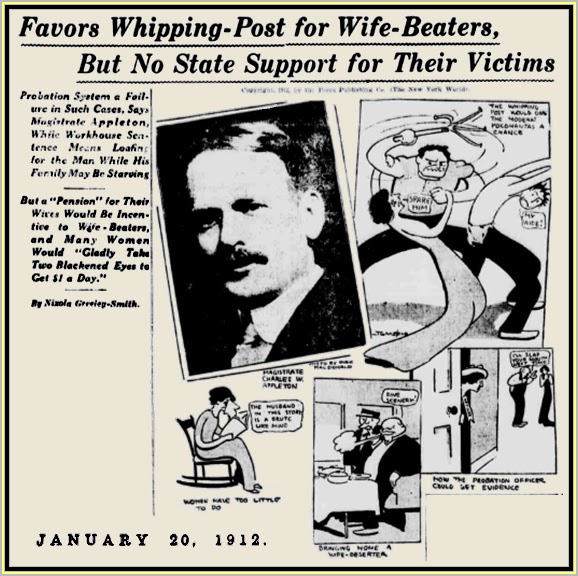 Enero de 1912. Este artículo expone que un magistrado está a favor del poste de azotes para los maltratadores, pero critica la inexistencia de prestaciones estatales para sus víctimas.