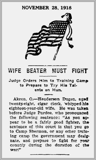 Noviembre de 1918. Un artículo de prensa recoge cómo un maltratador es condenado por un juez a ingresar en el campo de entrenamiento Sherman para entrar en el ejército y combatir en la guerra.