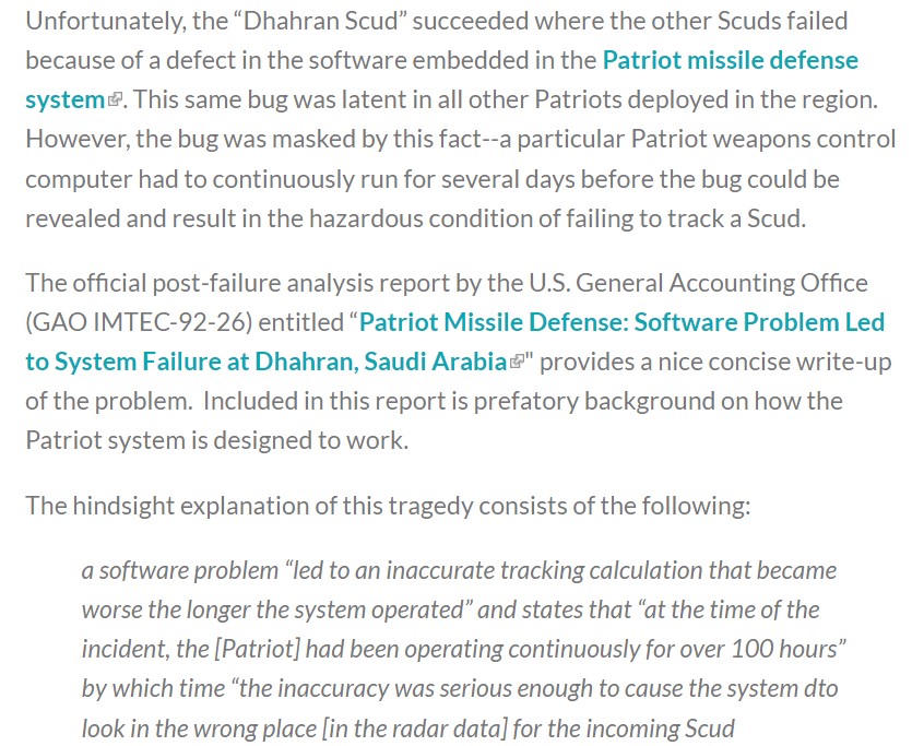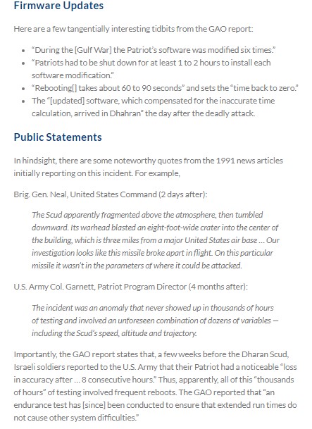 The U.S. General Accounting Office report (GAO IMTEC-92-26) titled “Patriot Missile Defense: Software Problem Led to System Failure at Dhahran, Saudi Arabia" gives a detailed technical analysis of why the Patriot software failed.