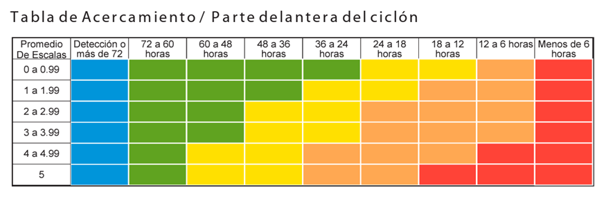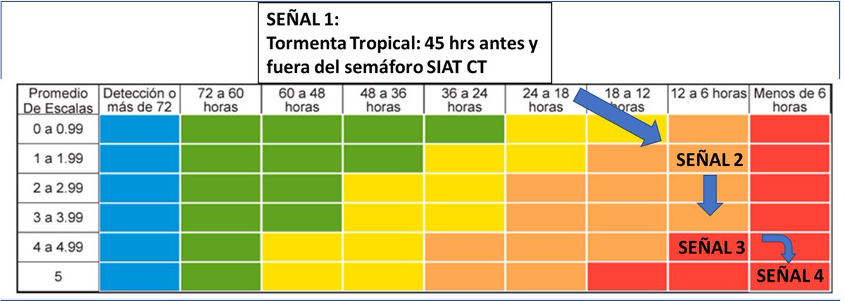 El SIAT CT proporciona el siguiente semáforo de alertas en función de las horas y la escala del huracán. Cada color corresponde a acciones específicas que el Sistema Nacional de Protección Civil lleva a cabo. Estas acciones no son arbitrarias y toman tiempo. ⤵️