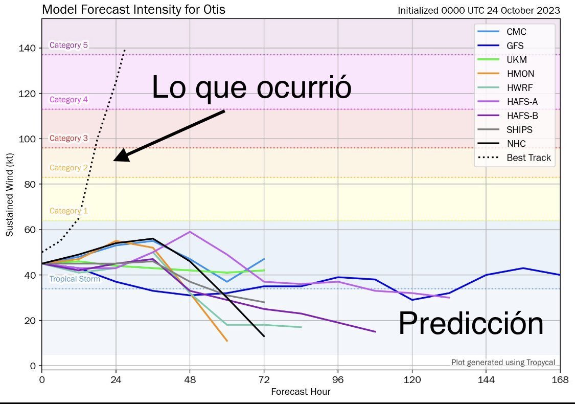 1) Ningún modelo climático fue suficiente para predecir la rápida intensificación del huracán. Sin embargo estos son mejorables conforme se cuente con nueva información. 2) 14 horas de que tocara tierra no se tenía un huracán. Solo tormenta tropical. ⤵️