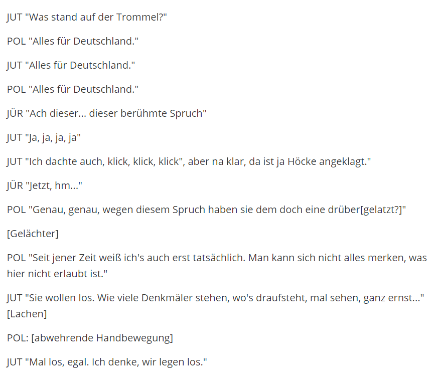 Höcke hätten "die dem" "wegen des "Spruchs eine drübergelatzt". Die Sache ist noch nicht einmal verhandelt, die Funktionsweise der Justiz in Deutschland sollte einem Polizisten bekannt sein. Und falls Zweifel bestehen, wer da wem was "drübergelatzt" hat,