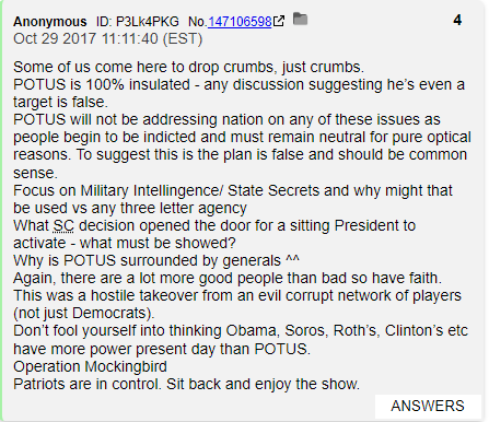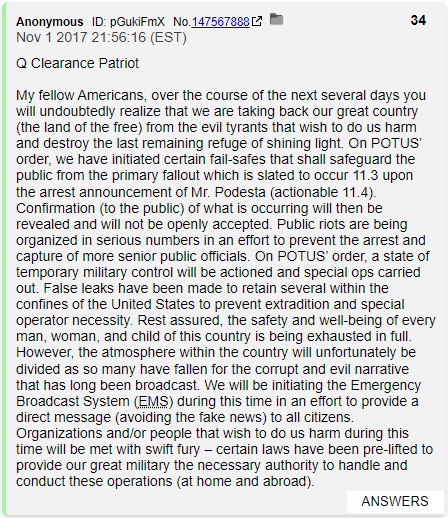 Notice in QDrop 34 that Q decided to buy himself another 24 hours. He suddenly says Podesta's arrest is "Actionable 11.4" cause he is looking for any excuse to extend the LARP.