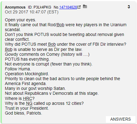 QDrop 3 paints the story of Robert Mueller, White Hat and that he was meeting with Trump to plan the Mueller investigation as a White Hat boomerang to crush the Deep State. This QDrop also contains the vital line "Many in our govt worship Satan."