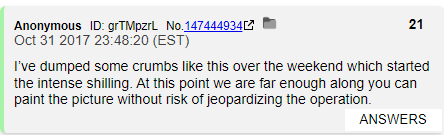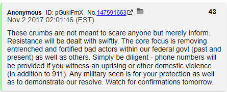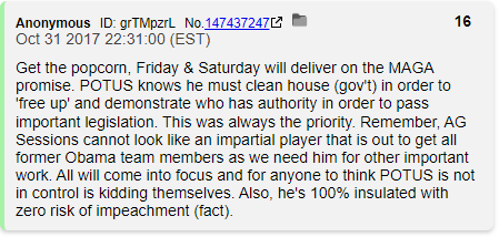 This isn't some vague prediction or something that was waiting for a 6 year delta. 10/31/17 was a Tuesday and Q was telling us that weekend the Deep State was being defeated.