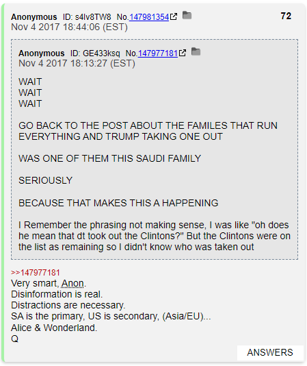 So how did it all end on 11/4? Q grabbed some Anon talking about MBS's power grab and took credit for it. "I was lying about America the whole time, but I had to so we could totally win in Saudi Arabia!" That's his excuse. "The dog ate my homework" would work on QAnon.