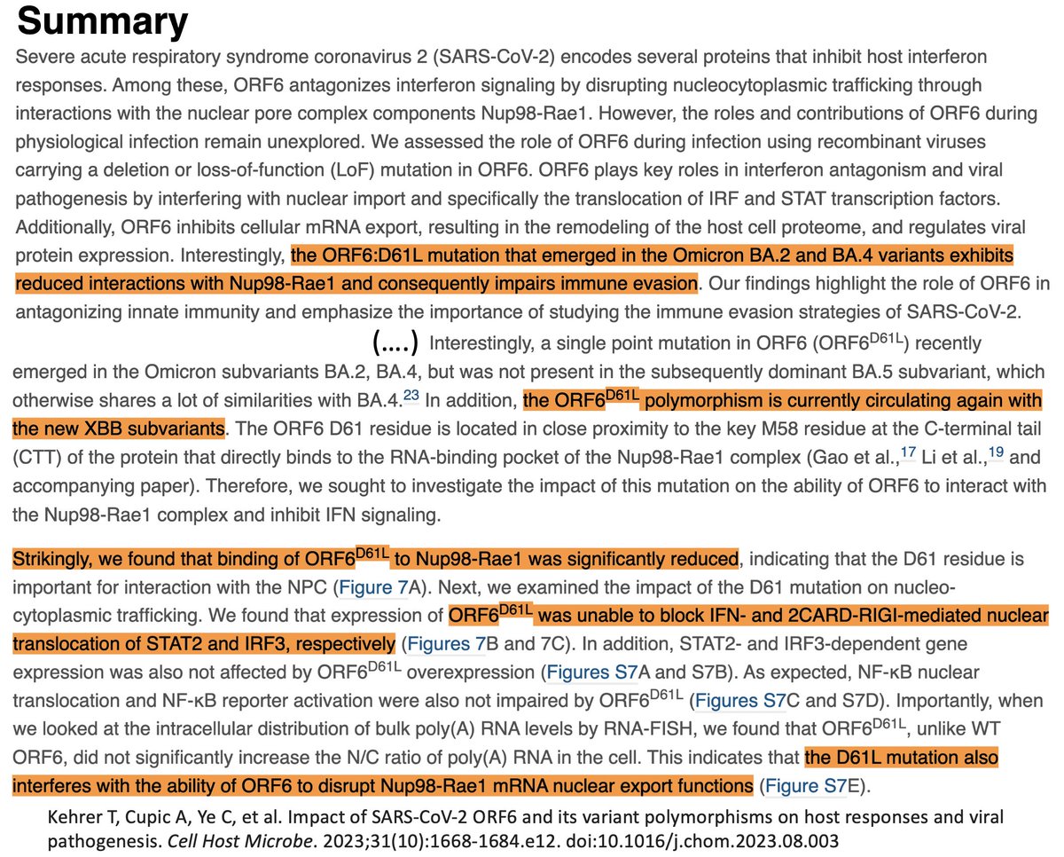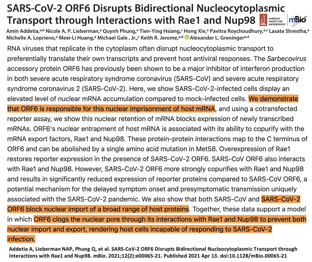 In a superb ORF6 paper published last month, @LisaMiorin & @KroganLab show that ORF6:D61L seriously impairs ORF6’s immune evasion function by reducing its ability to block cellular trafficking in & out of the nucleus. 12/45