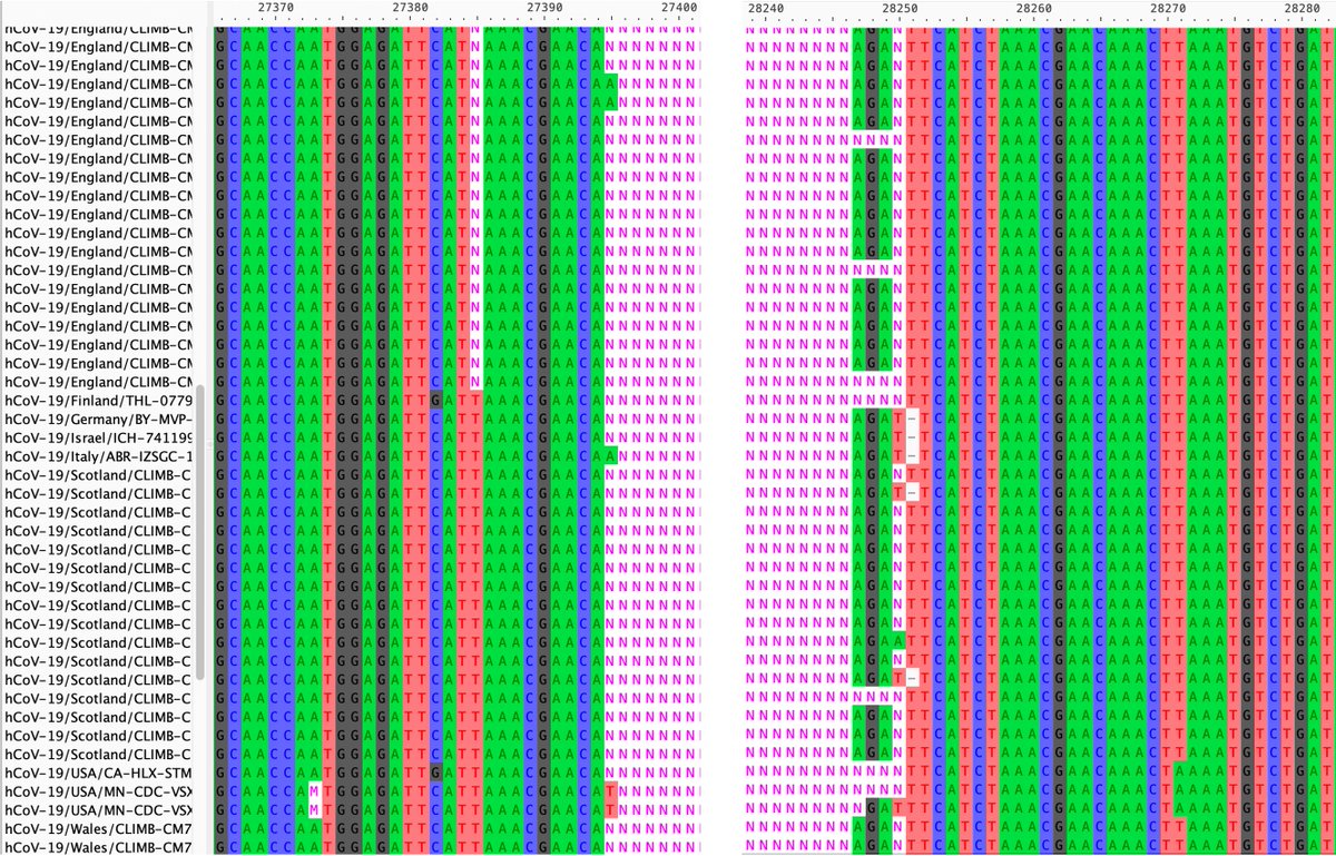 The deletion is so large & unexpected it confuses sequencing software, hence the NNN’s. Aligning genomes from this GW.5.1.1 branch with the invaluable Nextclade & viewing on Aliview, sequences from different countries & labs mostly match up well. 29/45