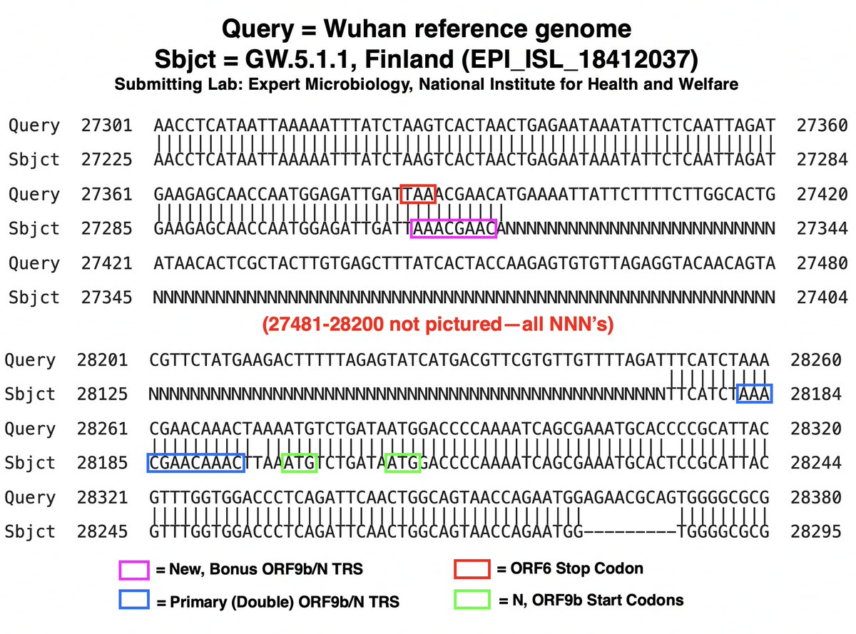 I actually consider this posited new TRS to be the 3rd one for N/ORF9b, the second consisting of a slightly suboptimal TRS with impressive extended homology on its 3’ end (right side)—4/5 and 8/11 are perfect matches for the 3’ end of the TRS-L. 34/45
