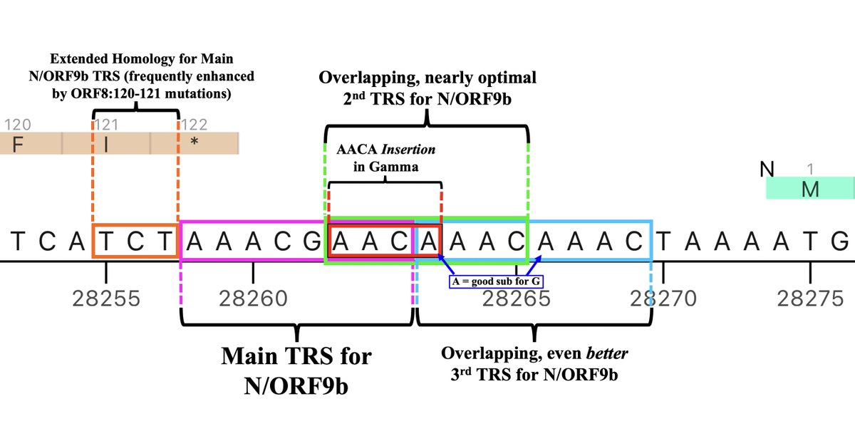 Adding something like a 3rd TRS for N/ORF9b, however, is not *entirely* unprecedented. Gamma had a 4-nucleotide insertion in the middle of the N/ORF9b double TRS that, astonishingly, added a third, overlapping TRS. 35/45