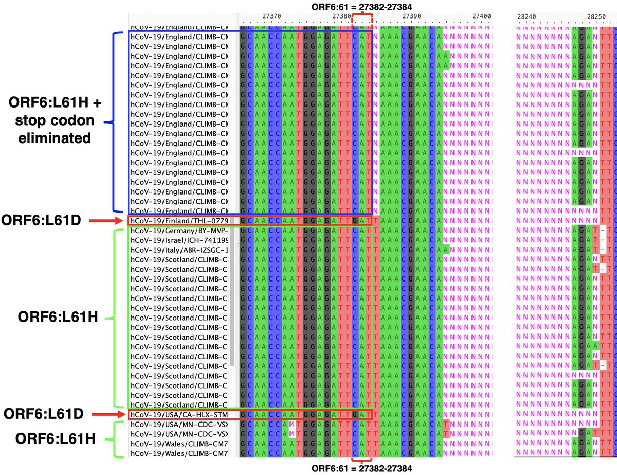 ORF6:D61L is a TRS-related mutation that almost certainly arose due to a “copy-choice” recombination event. D61L creates extended homology for the ORF7a TRS, which should increase its expression (i.e. create more copies of ORF7a mRNA). 14/45
