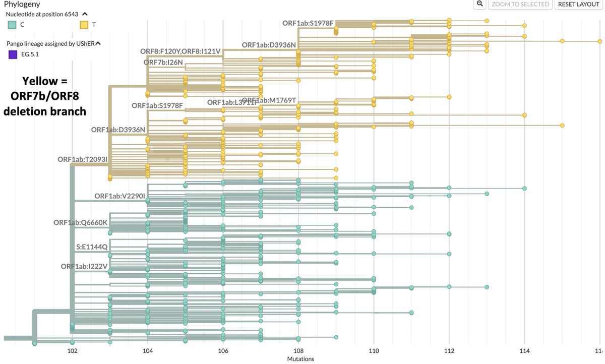While nothing has been confirmed yet, I believe a large branch of GW.5.1.1 likely has a deletion spanning ORF7a, ORF7b, and ORF8. Nearly every genome in this branch has NNN’s (which signify “unknown”) starting just before ORF7a & ending just after ORF8. 28/45